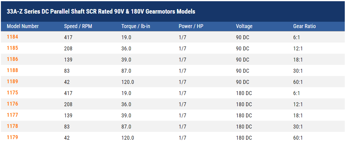 33A motors provide high starting torque, adjustable speed, and predictable performance under a wide range of operating conditions. The maximum rated armature speed is 2500 rpm.
